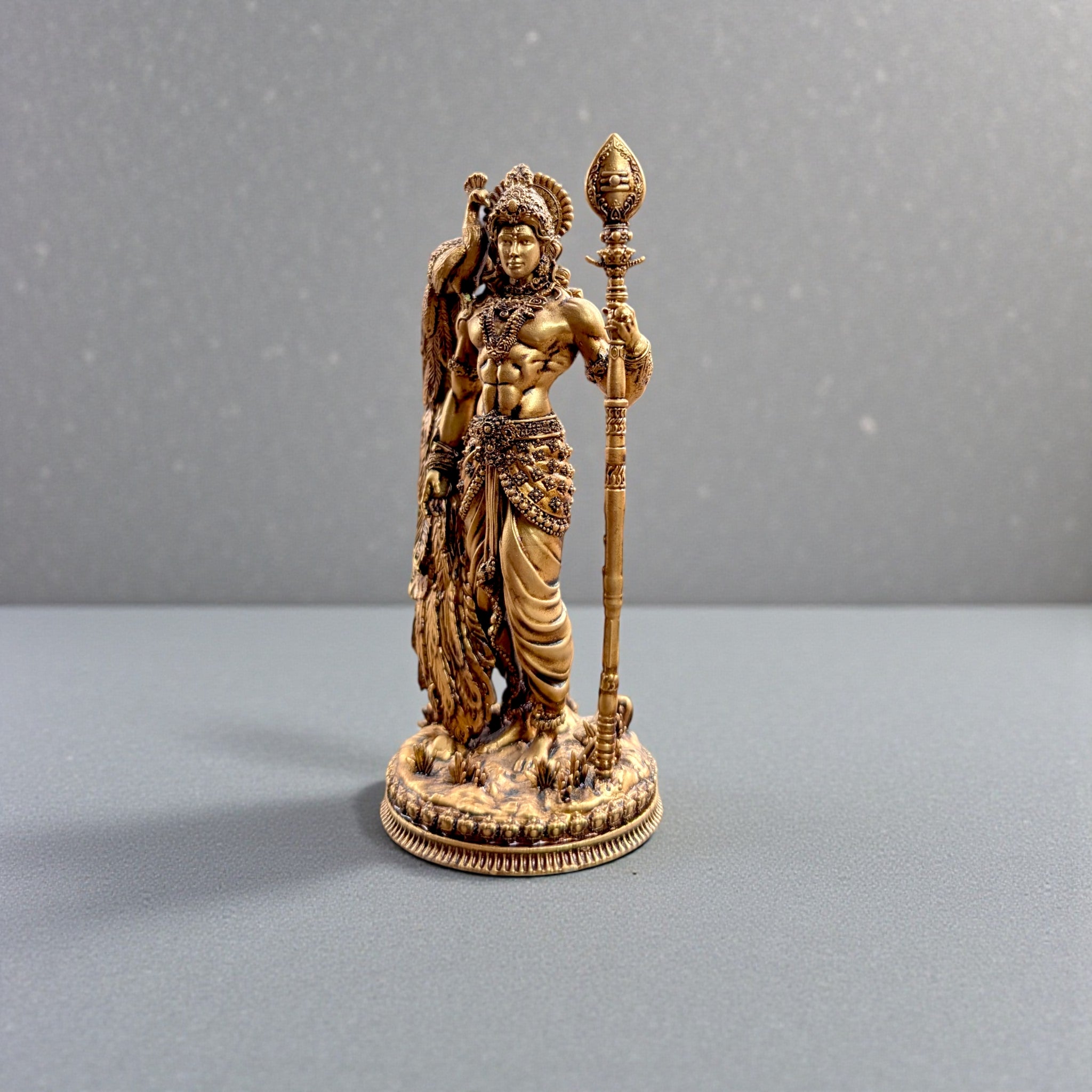 This premium idol captures Lord Kartikeya in his majestic standing form, holding the sacred Vel (divine spear), which represents the power to overcome obstacles and negativity. His sacred vehicle, the Peacock, stands gracefully beside him, symbolizing victory over ego, pride, and fear. Every detail—from the ornaments and posture to the intricate textures—has been carefully designed to create an idol that radiates both spiritual significance and premium aesthetic beauty.